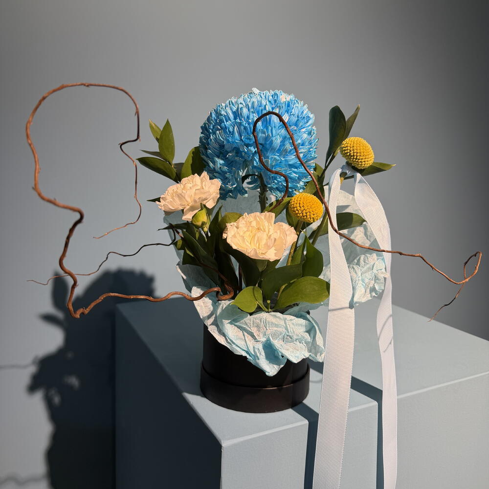 Ruscus - 5 pcs white carnations - 2 pcs blue ribbon - 1 pcs box black - 1 pcs dry brunches - 2 pcs blue deco chrysanthemum - 1 pcs graspedia - 2 pcs blue tissue - 1 pcs