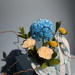 A satement arrangement designed with cool tones and modern contrast. A bold blue focal bloom is balanced with soft ivory florals, fresh greenery, and sculptural details, creating a piece that feels artistic, confident, and contemporary. Perfect for desks, small spaces, or when you want to send something unexpected yet refined.