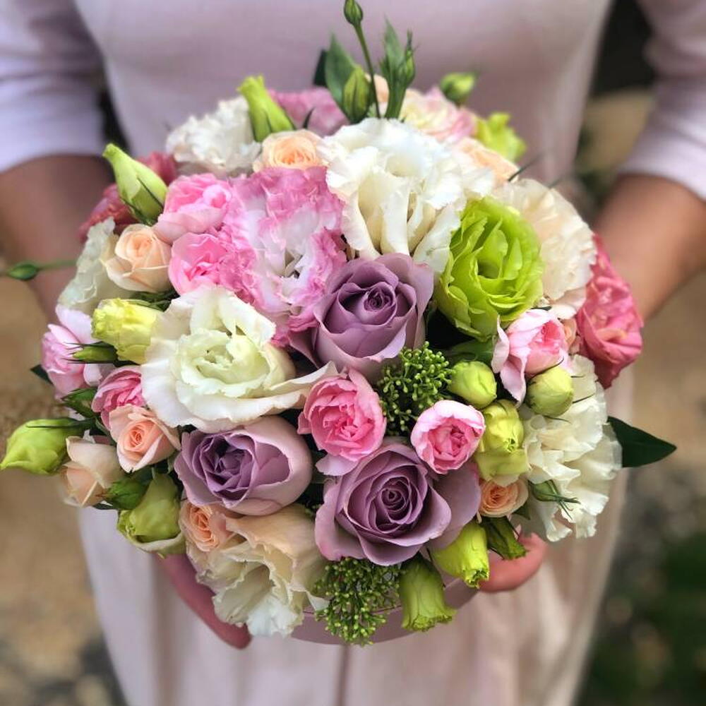 Box - 1 pcs Lisianthus - 4 pcs skimmia - 1 pcs dianthus spray - 2 pcs rose sprey madame bombastic - 2 pcs rose ecuador faith light purple - 3 pcs