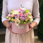Composition: Rose spray Madame Bombastic - 2, Lisianthus - 4, Skimmia - 1, Rose Ecuador Faith light purple - 3, Dianthus spray - 2, box - 1 Sizes: WIDTH - 17CM; HEIGHT - 19CM; LENGTH - 19CM; (including packaging) Size: 17 x 19 x 19 cm