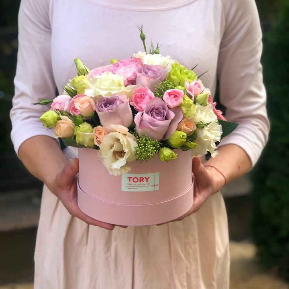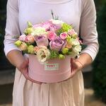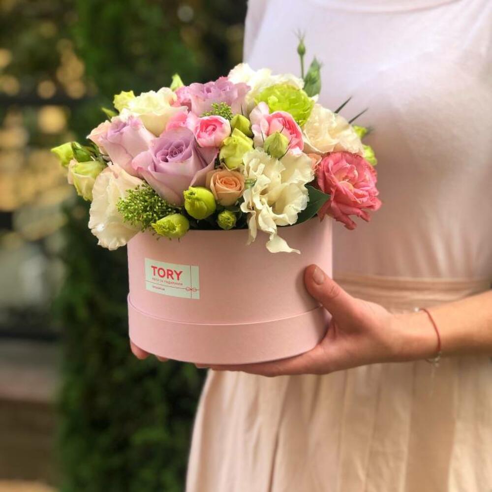 Composition: Rose sprey Madame Bombastic - 2, Lisianthus - 4, Skimmia - 1, Rose Ecuador Faith light purple - 3, Dianthus spray - 2, box - 1 Sizes: WIDTH - 17CM; HEIGHT - 19CM; LENGTH - 19CM; (including packaging) Size: 17 x 19 x 19 cm