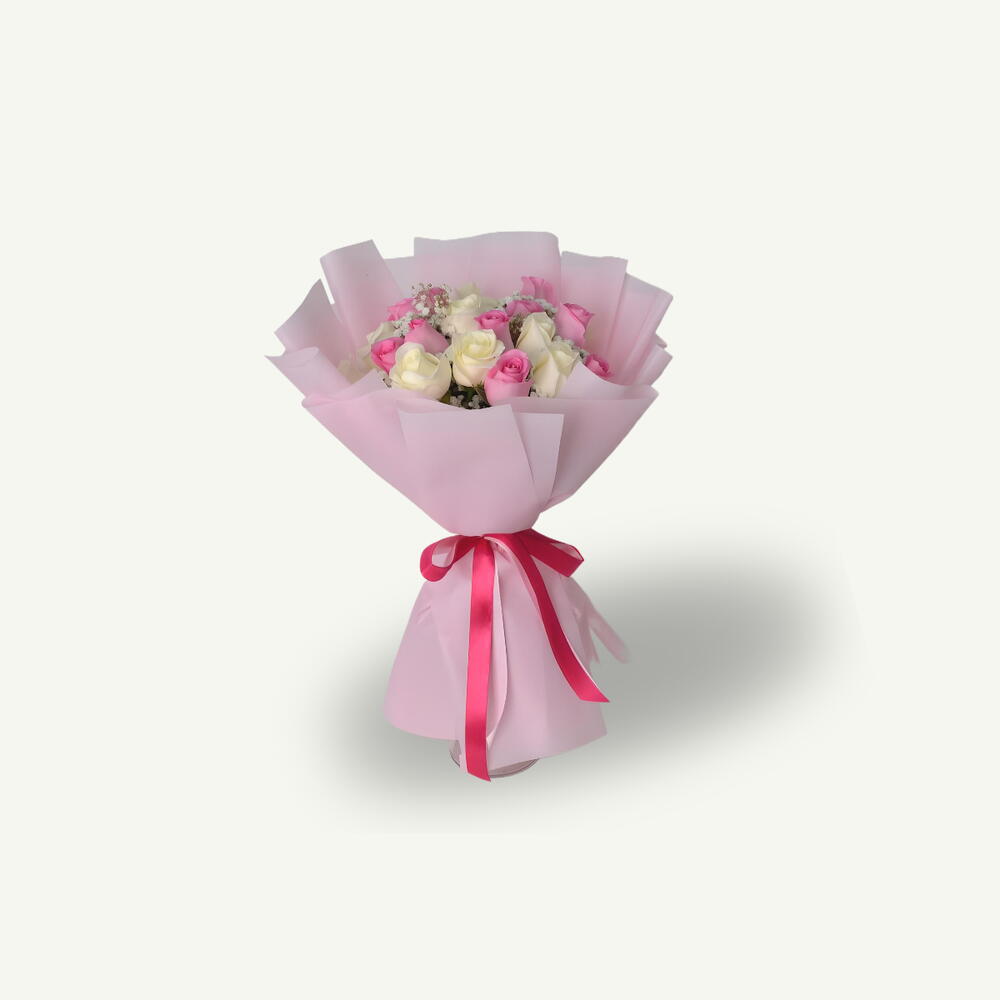 Hand-tied bouquet with a delicate mix of 10 pink and 10 white roses, paired with soft gypsophila, gently crafted in elegant light pink wrapping for a timeless and romantic feel.