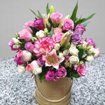 This luxurious flower box overflows with romance and elegance, combining soft pink, creamy white, and delicate lilac tones into a harmonious and expressive arrangement. Perfect for birthdays, anniversaries, engagements, weddings, Mother’s Day, or as a heartfelt “just because” gift, it adds tenderness and sophistication to any occasion. The composition features classic roses, graceful spray roses, lush lilies, and delicate seasonal blooms that bring depth, volume, and refined charm. Fresh greenery adds natural texture and contrast, enhancing the bouquets vibrant yet gentle character. To keep the arrangement fresh, place it in a cool area and ensure the floral foam stays slightly moist by adding a small amount of water every 1–2 days. Avoid direct sunlight, drafts, and heat sources to preserve the beauty of the flowers. With minimal care, this stunning composition will delight for many days.