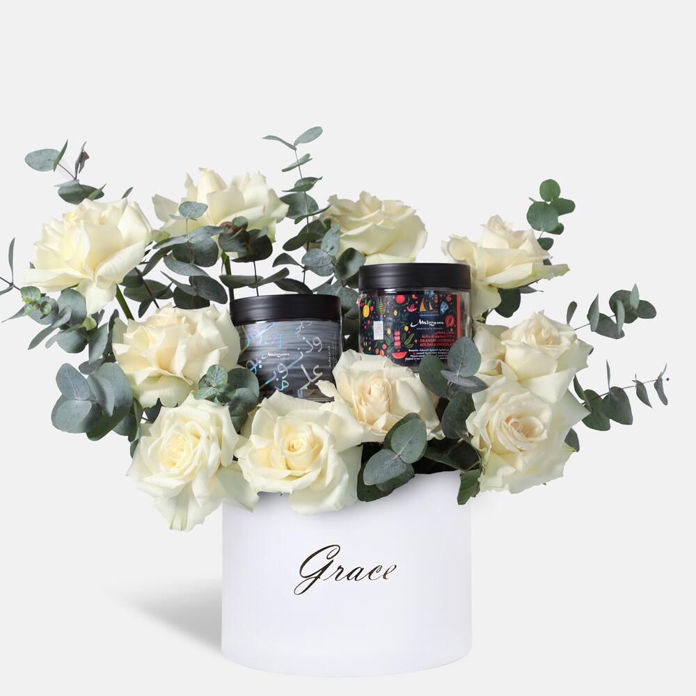 Eucalyptus - 2 pcs white roses - 10 pcs mirzam salty pearl in jar - 230 g mirzam dark chocolate 62% orange covered - 200 g