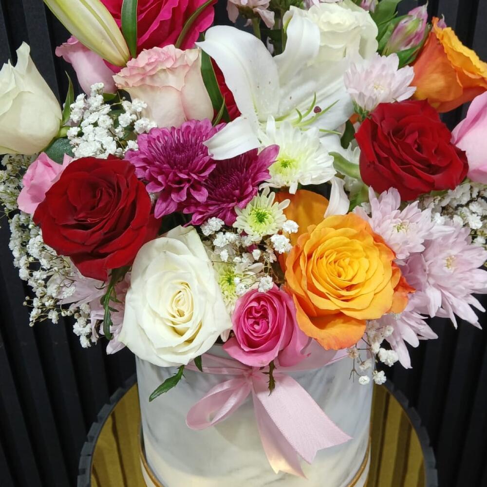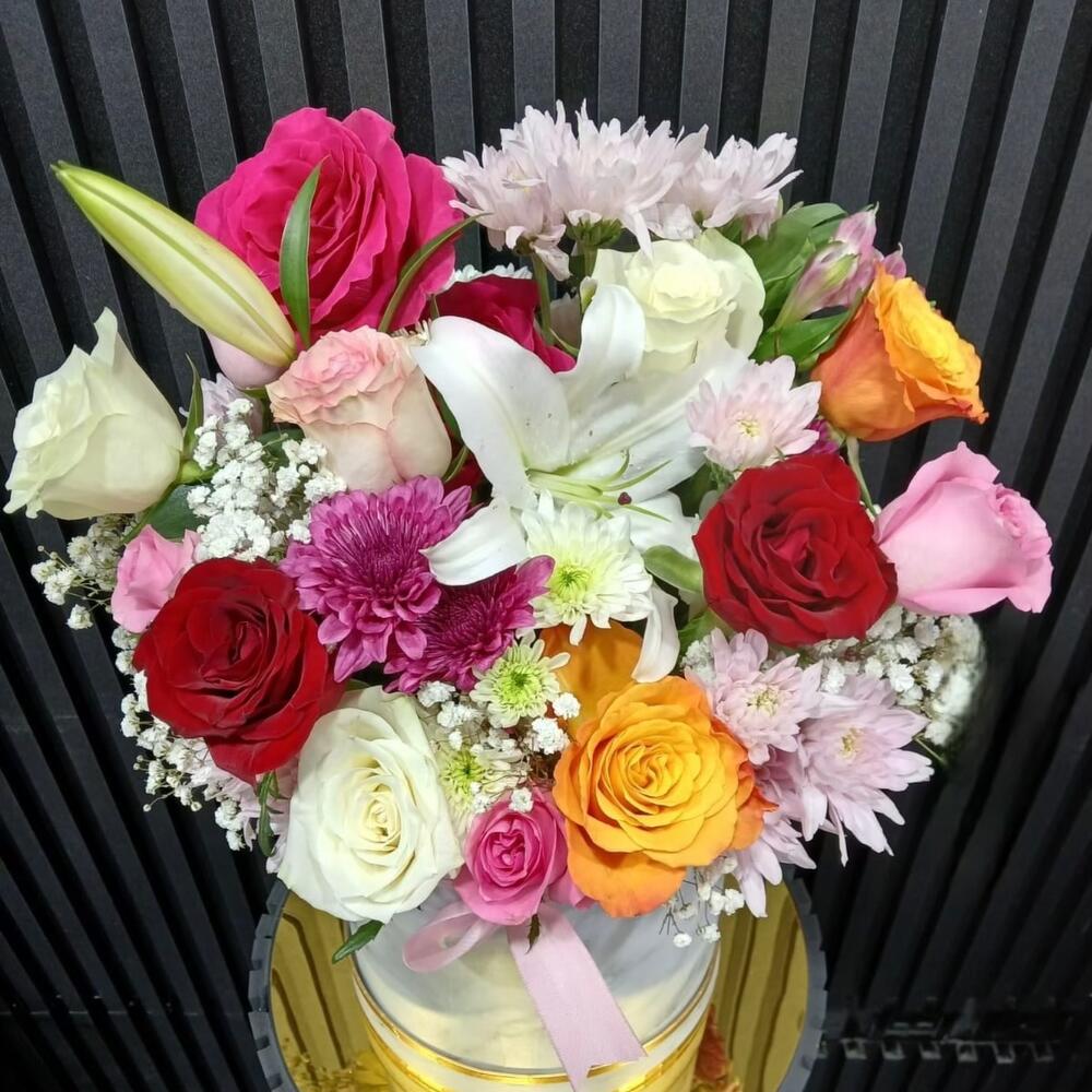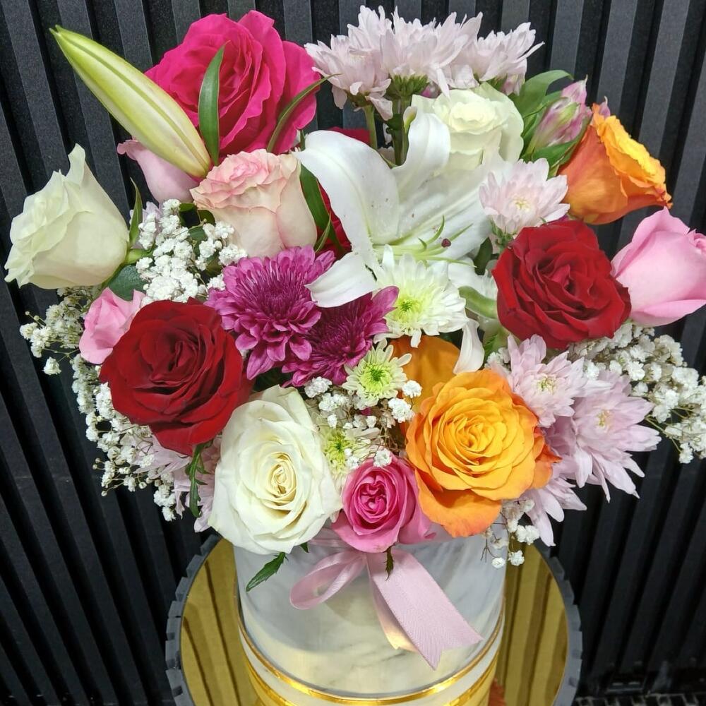 Box - 1 pcs Gypsophila - 1 pcs Yellow rose - 2 pcs white alstroemeria - 1 pcs white chrysanthemum - 1 pcs pink chrysanthemum - 4 pcs white lily - 1 pcs red roses - 2 pcs pink roses - 5 pcs white roses - 3 pcs