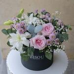 Box Arrangement of 2 stems of pink roses 2 stems of white lilies and 5 stems of pink chysanthemum in a black box