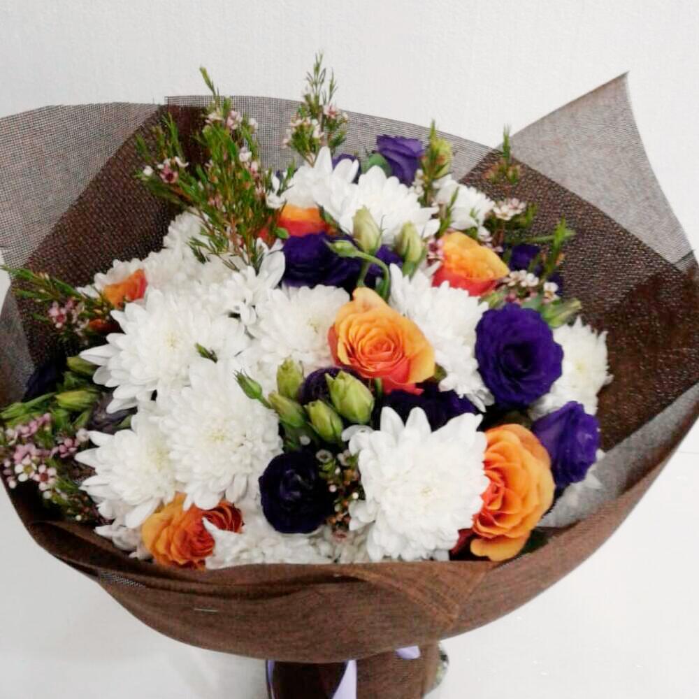 Limonium - 7 pcs chrysanthemum bush - 5 pcs orange rose - 6 pcs lisianthus blue - 4 pcs