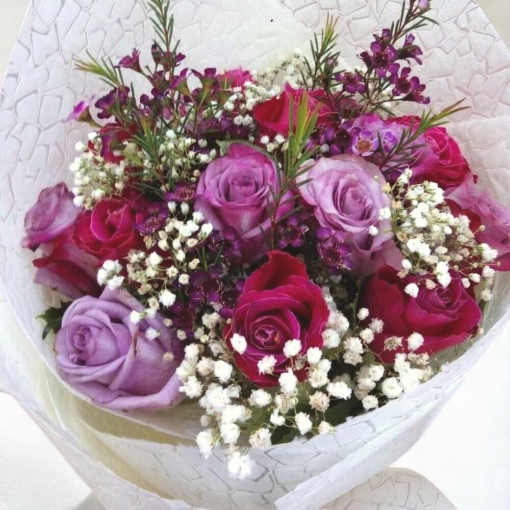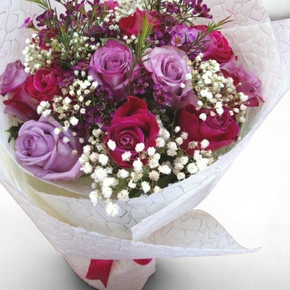 A graceful blend of deep red and lilac roses, this bouquet radiates elegance and charm. Accented with sprigs of waxflowers, baby’s breath, and rosemary-like greenery, it’s a stunning composition ideal for romantic gestures, anniversaries, or any heartfelt occasion. Wrapped in a textured white paper and tied with a red ribbon, it’s a true showstopper. To care for your bouquet, trim the stems diagonally every two days, place it in clean water, and keep it in a cool area away from direct sunlight and heat. The image displayed is indicative in nature. Actual product may vary in shape or design as per the availability. Flowers may be delivered in fully bloomed, semi-bloomed or bud stage. The chosen delivery time is an estimate and depends on the availability of the product and the destination to which you want the product to be delivered. Since flowers are perishable in nature, we will be able to attempt delivery of your order only once. The delivery cannot be redirected to any other address. This product is hand delivered and will not be delivered along with courier products. Occasionally, substitution of flowers is necessary due to temporary and/or regional unavailability issues