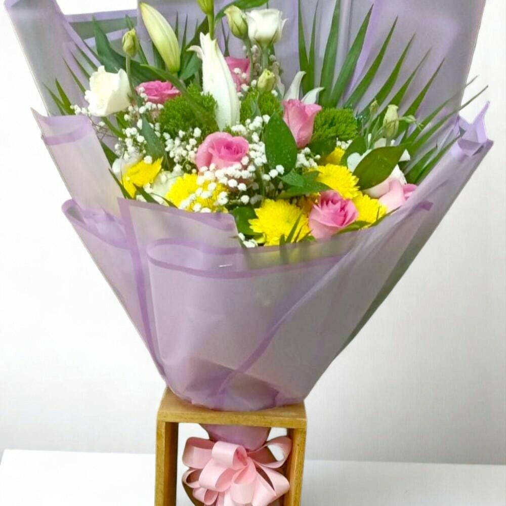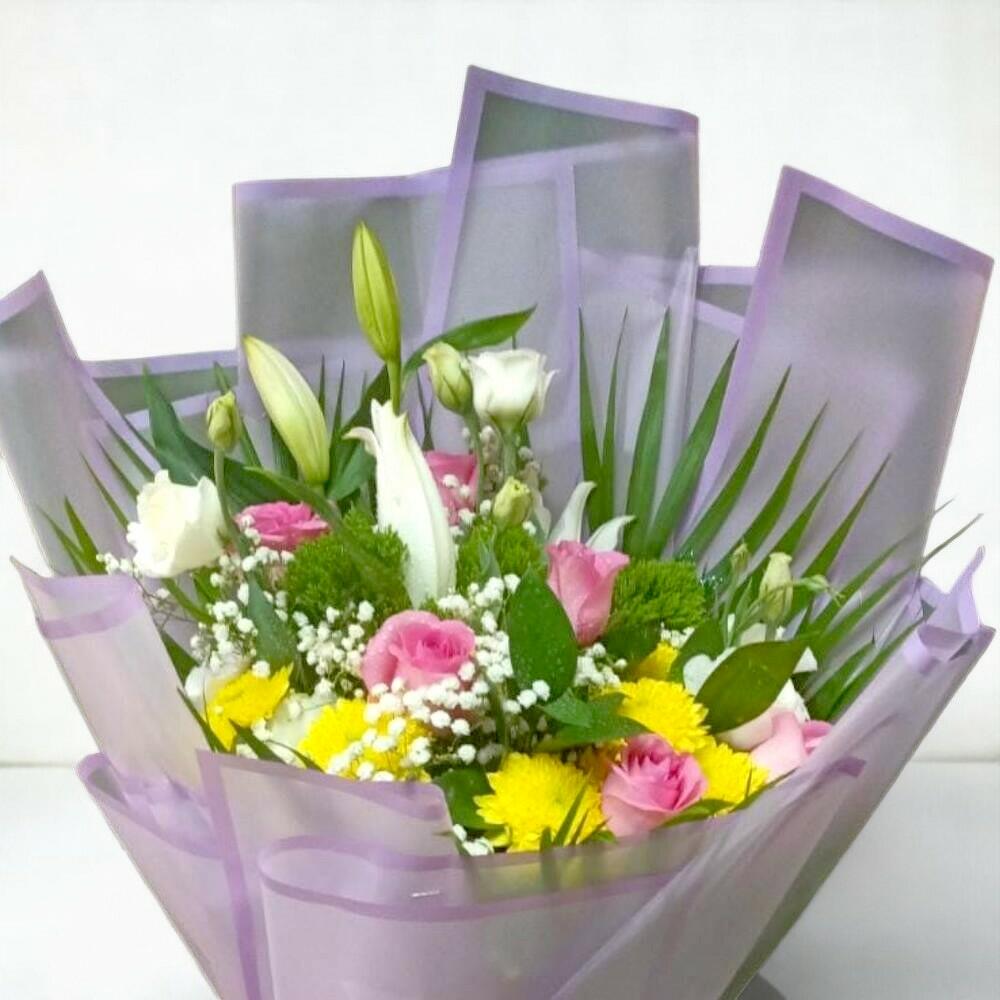 This joyful bouquet is a vibrant celebration of color and life. Bright yellow, soft pink, and creamy white blooms are gracefully arranged with lush greens and exotic foliage, creating a fresh and elegant look. Wrapped in soft lavender packaging and tied with a pastel pink bow, this bouquet is perfect for birthdays, anniversaries, or simply to bring a smile. The mix of textures and tones makes it visually stunning and emotionally uplifting. To keep your bouquet looking fresh, trim the stems diagonally and place in clean water. Change the water every two days and keep it away from direct sunlight or heat sources. Spray lightly with water to maintain moisture in the foliage. The image displayed is indicative in nature. Actual product may vary in shape or design as per the availability. Flowers may be delivered in fully bloomed, semi-bloomed or bud stage. The chosen delivery time is an estimate and depends on the availability of the product and the destination to which you want the product to be delivered. Since flowers are perishable in nature, we will be able to attempt delivery of your order only once. The delivery cannot be redirected to any other address. This product is hand delivered and will not be delivered along with courier products. Occasionally, substitution of flowers is necessary due to temporary and/or regional unavailability issues