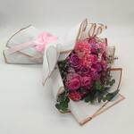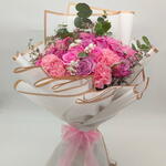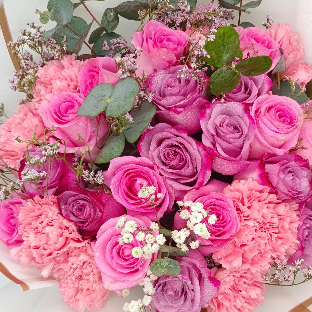 Eucalyptus - 7 pcs Pink ribbon - 1 pcs Gypsophila - 2 pcs purple rose - 10 pcs limonium purple - 10 pcs carnition pink - 10 pcs pink roses - 10 pcs white cover with gold border - 6 pcs