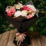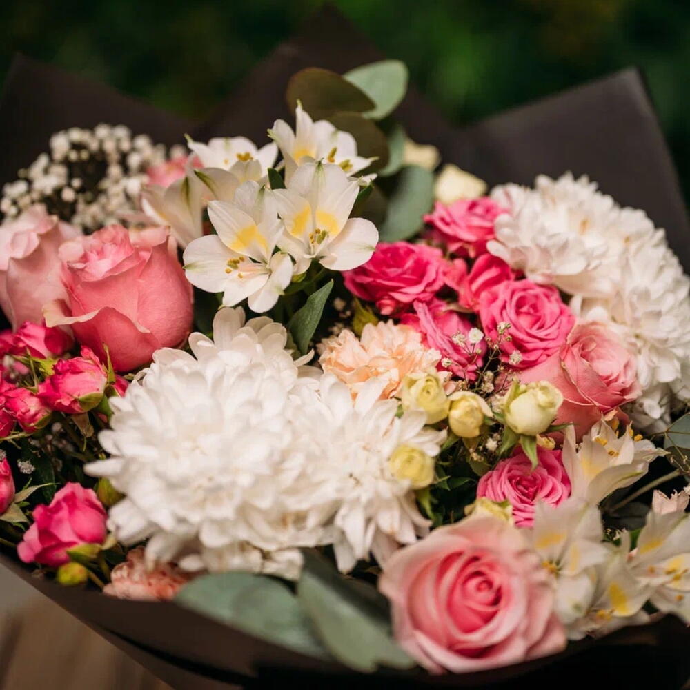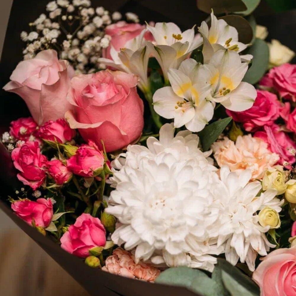 Eucalyptus - 3 pcs Spray rose - 4 pcs Chrysanthemum - 2 pcs Alstroemeria - 2 pcs Gypsophila - 2 pcs rose - 5 pcs carnation - 2 pcs
