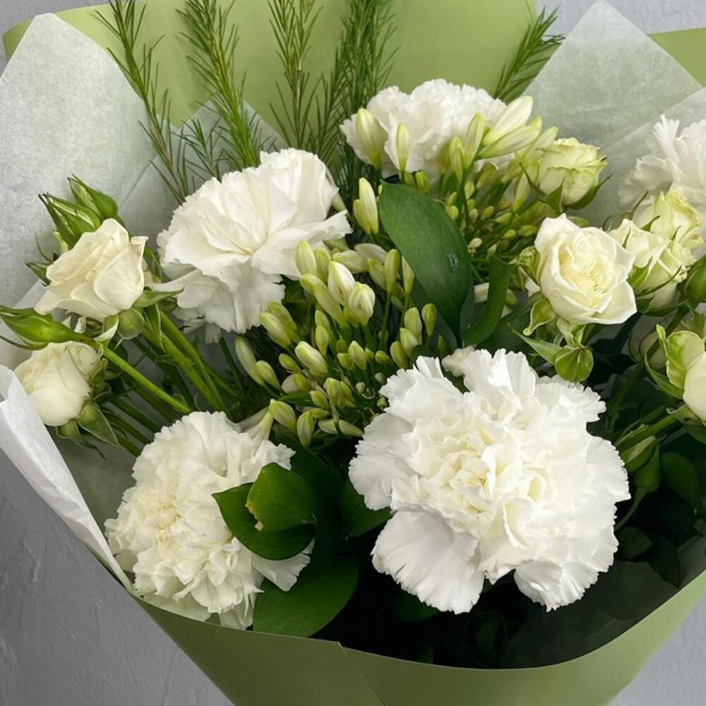 Ruscus - 2 pcs Spray rose - 3 pcs Greens - 2 pcs carnation - 5 pcs asparagus - 2 pcs