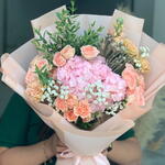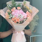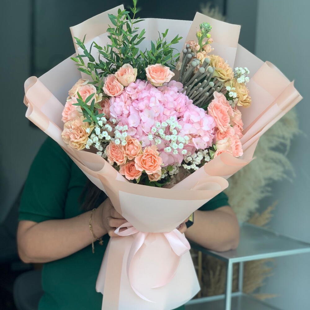 Brunia - 1 pcs Eucalyptus - 2 pcs Spray rose - 5 pcs Gypsophila - 2 pcs carnation - 5 pcs hydrangea pink - 1 pcs