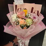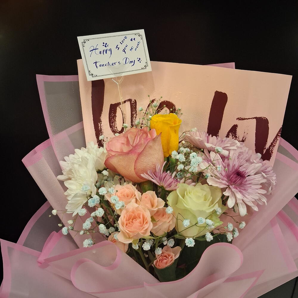 White rose - 2 pcs Yellow rose - 2 pcs pink carnation - 3 pcs pink roses - 2 pcs
