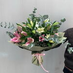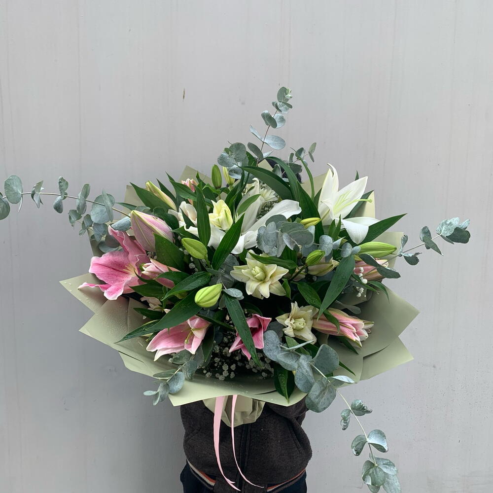 Eucalyptus - 5 pcs gypsophilia - 4 pcs pink lilies - 5 pcs white lily - 5 pcs