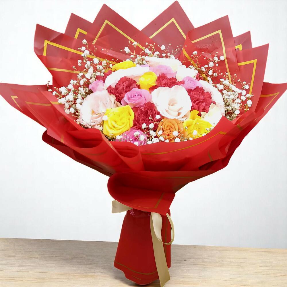 A stunning arrangement of 30 mixed roses, showcasing a vibrant palette of colors. This bouquet combines the elegance of different rose varieties, creating a beautiful and thoughtful expression of love, joy, and appreciation. Each bloom is carefully selected to ensure a harmonious blend, making it a perfect gift for various occasions.