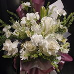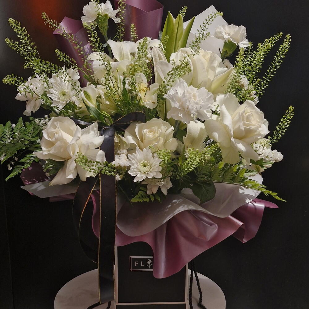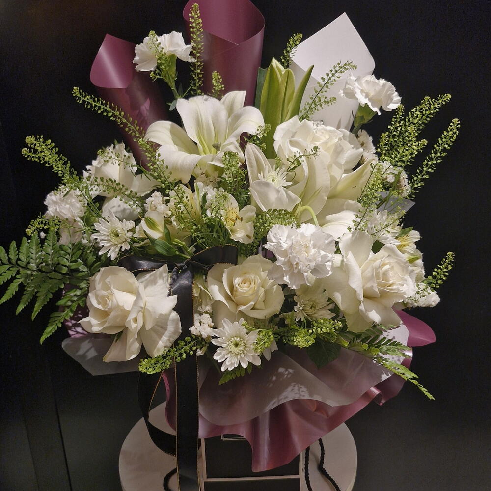 Chrysanthemum white - 2 pcs rose white - 6 pcs alstroemeria white - 3 pcs carnation white - 5 pcs lilies white - 1 pcs lipidium green - 6 pcs lether leaves - 3 pcs