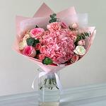 white carnations - 2 pcs pink carnations - 2 pcs hydrangea pink - 1 pcs dinara baby rose - 3 pcs wrapping paper pink - 3 pcs eulcyptus - 3 pcs