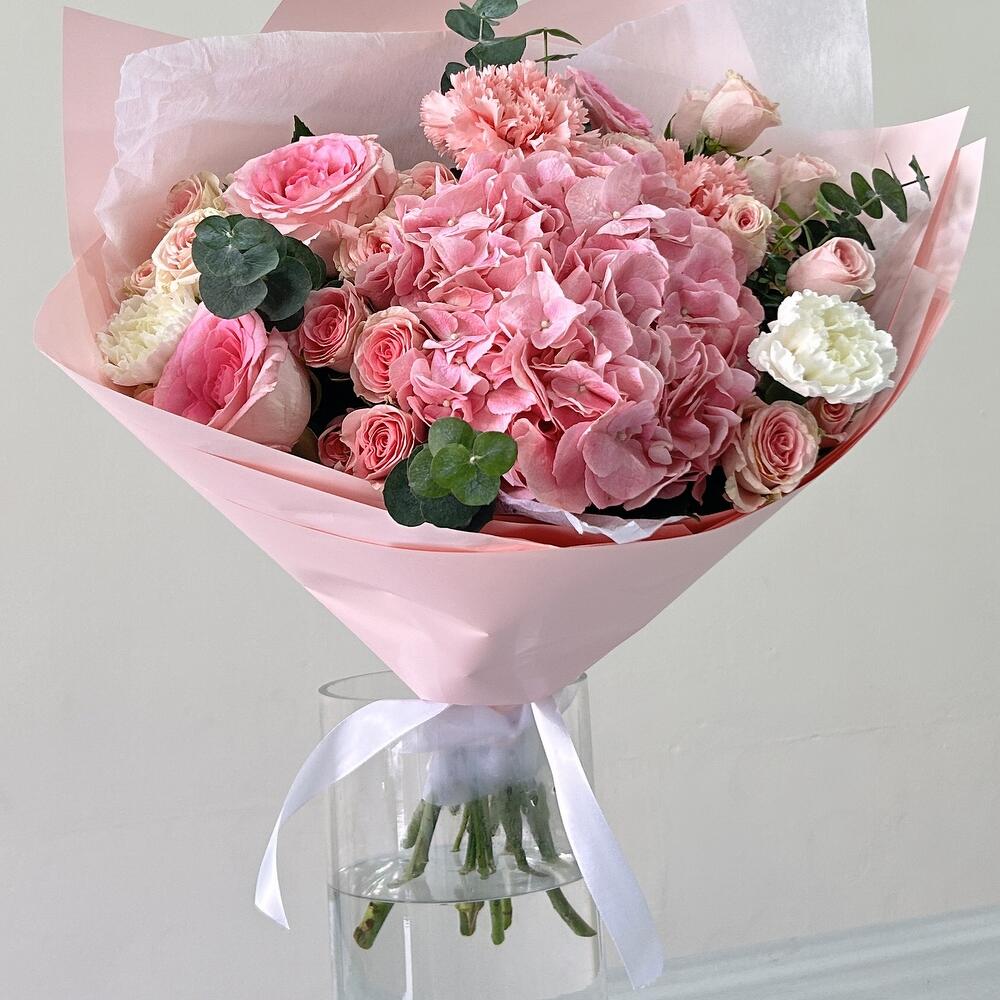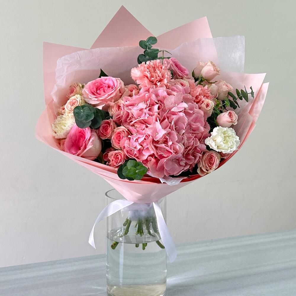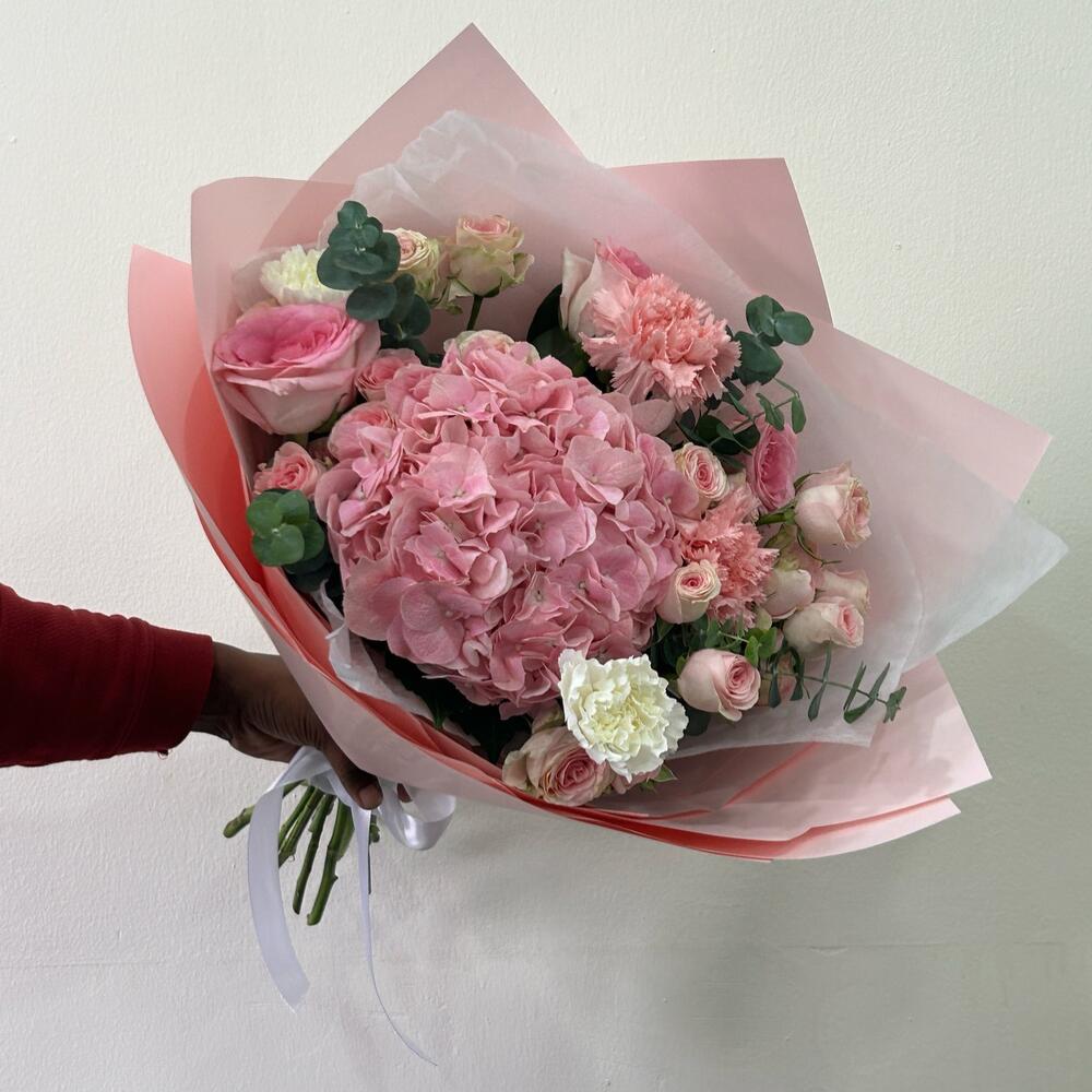 white carnations - 2 pcs pink carnations - 2 pcs hydrangea pink - 1 pcs dinara baby rose - 3 pcs wrapping paper pink - 3 pcs eulcyptus - 3 pcs
