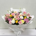 Yellow rose - 3 pcs carnation white - 5 pcs carnation pink - 4 pcs gerbera pink - 2 pcs tenacitam - 3 pcs single ruscus - 4 pcs baby rose pink - 3 pcs pink revival rose - 4 pcs matthiola white - 2 pcs carnation yellow - 3 pcs gerbera peach - 2 pcs mattiullah brown - 1 pcs