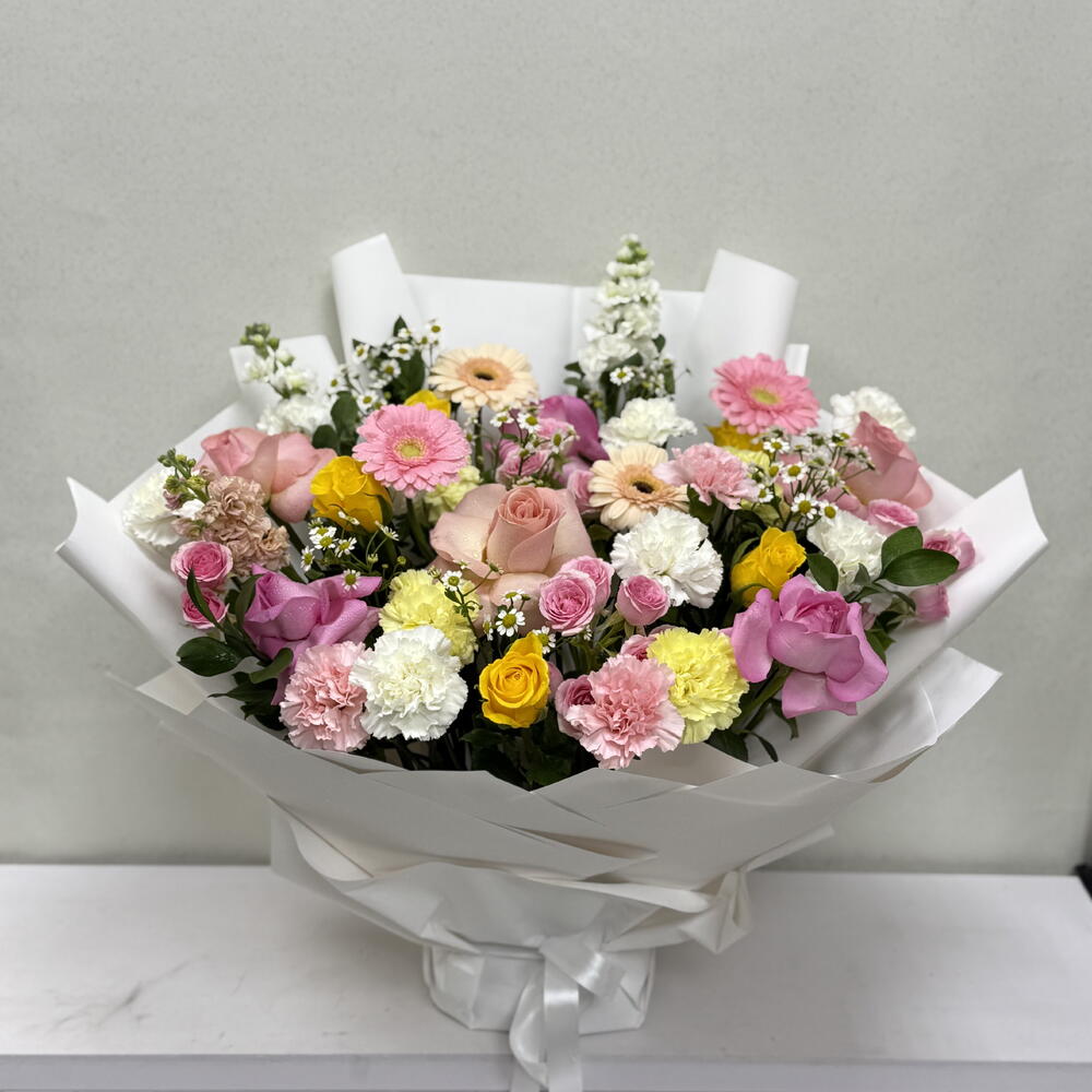 Yellow rose - 3 pcs carnation white - 5 pcs carnation pink - 4 pcs gerbera pink - 2 pcs tenacitam - 3 pcs single ruscus - 4 pcs baby rose pink - 3 pcs pink revival rose - 4 pcs matthiola white - 2 pcs carnation yellow - 3 pcs gerbera peach - 2 pcs mattiullah brown - 1 pcs