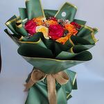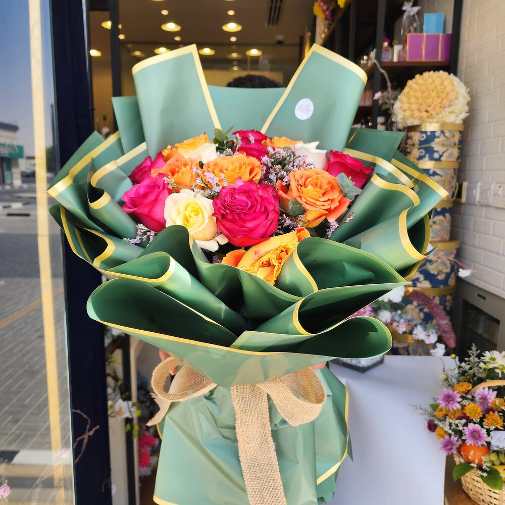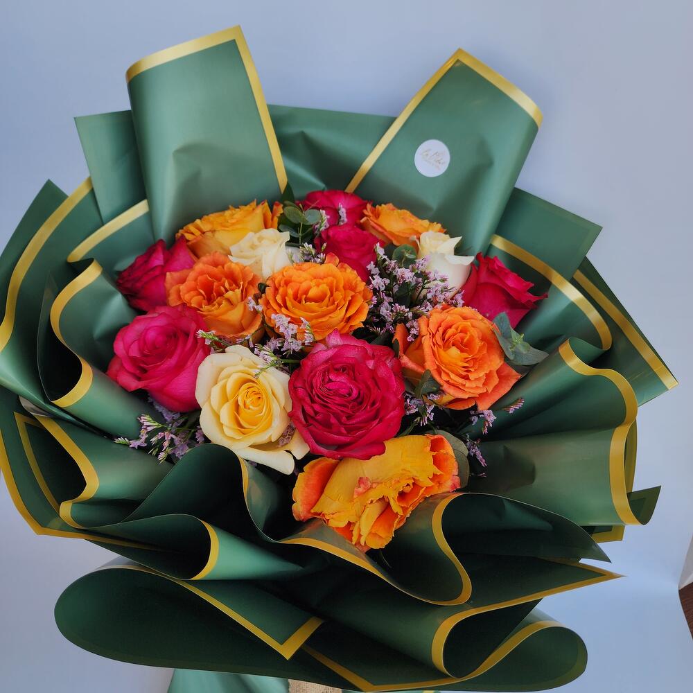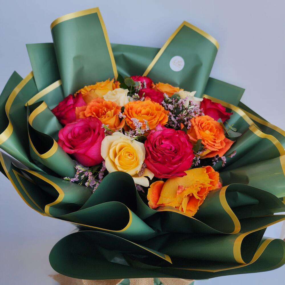 Bouquet Size - Large Mixed Roses Bouquet wrapped in custom style green wrapping. Tied with a jute bow for an extra elegant look.
