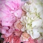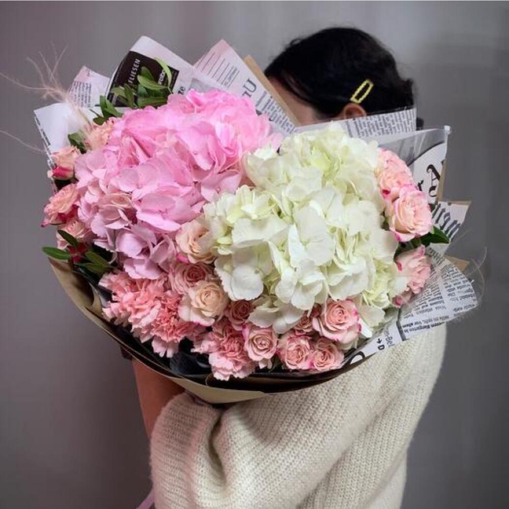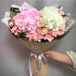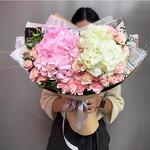 Ribbon - 1 pcs pink carnations stems - 3 pcs white hydrangea - 1 pcs pink hydrangea - 1 pcs designer wrapping - 2 pcs pink baby rose stem - 4 pcs
