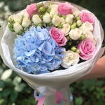 Ribbon - 1 pcs Pink rose - 5 pcs Decoration - 3 pcs blue hydrangea - 1 pcs white eustoma - 1 pcs white baby rose - 6 pcs