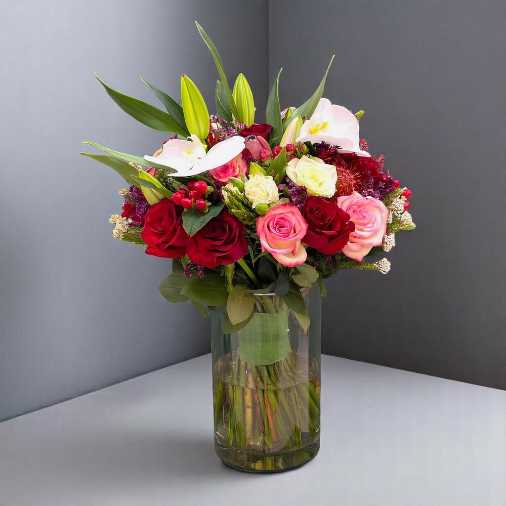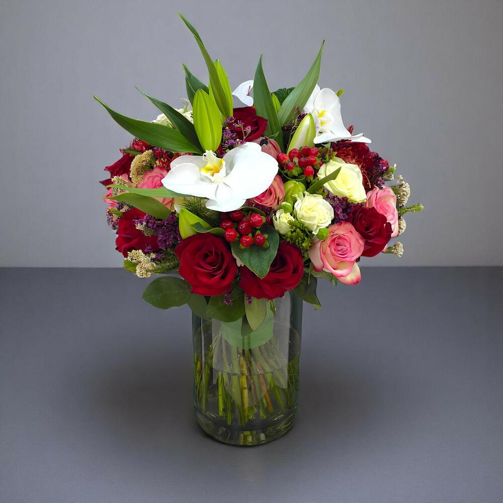 Lily - 2 pcs Vase - 1 pcs african mix - 7 pcs baby roses - 5 pcs mix roses - 20 pcs orcid cut flowers - 1 pcs haybricom - 5 pcs
