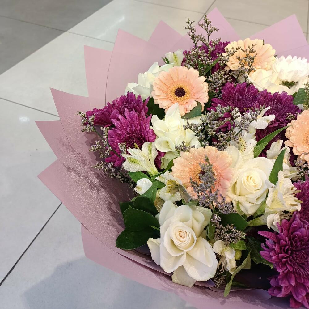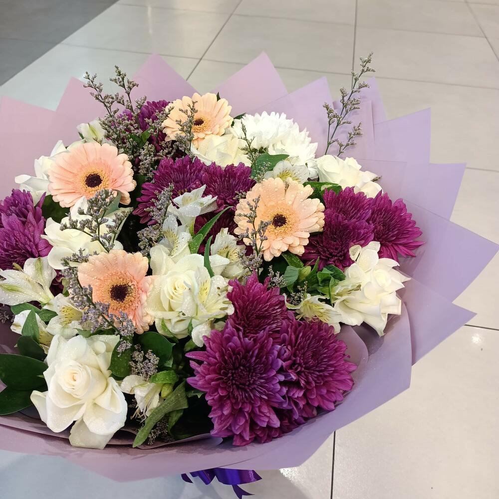 This beautiful bouquet features a harmonious blend of vibrant flowers, predominantly in shades of lavender, peach, and white. It includes striking lavender chrysanthemums, soft peach gerbera daisies, and delicate white alstroemeria, complemented by subtle green foliage and wispy filler flowers. The entire arrangement is elegantly wrapped in a matching lavender paper, tied with a rich purple ribbon, creating a visually appealing and thoughtful gift.