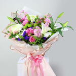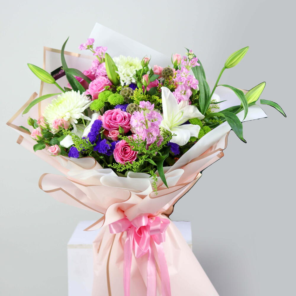 A delightful mix of white and pink blooms, artfully arranged to create a fresh and romantic bouquet that radiates grace and charm.