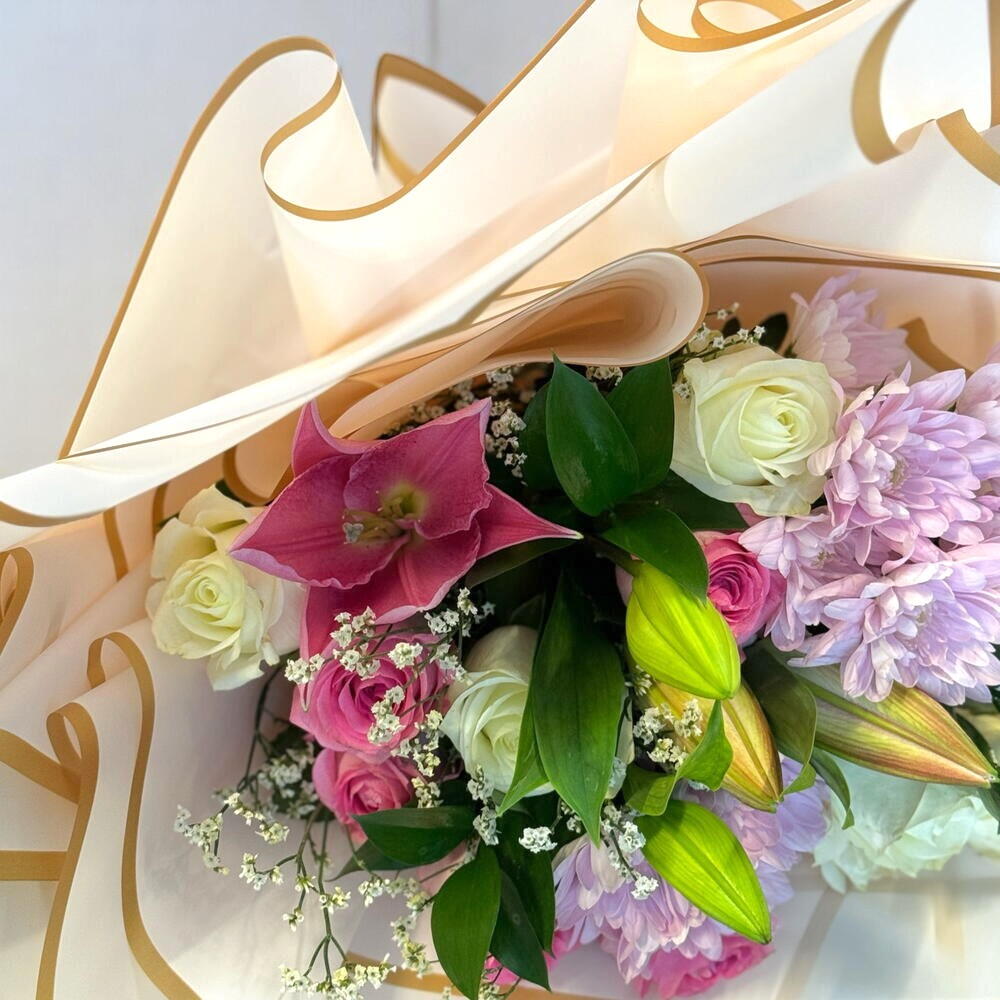 A radiant harmony of soft pastels and vibrant pinks, the Blushing Elegance bouquet is the perfect gift for any romantic gesture, celebration, or heartfelt moment. Featuring fresh lilies, roses, and chrysanthemums wrapped in elegant designer paper, this bouquet delivers both charm and meaning. Care Tips: Unwrap the bouquet and place the stems in a clean vase filled with room temperature water. Trim the stems at an angle and remove any leaves below the waterline. Refresh the water every two days and keep the bouquet in a cool area, away from direct sunlight or drafts. Lilies may take a couple of days to fully bloom, enhancing the bouquets beauty over time.