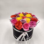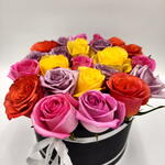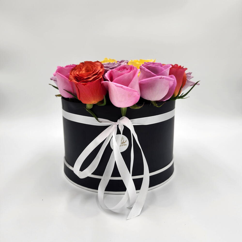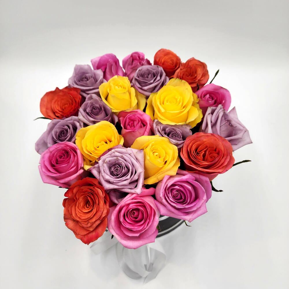 flower box - 1 pcs fresh yellow roses - 4 pcs fresh pink roses - 7 pcs fresh orange roses - 5 pcs fresh purple roses - 7 pcs