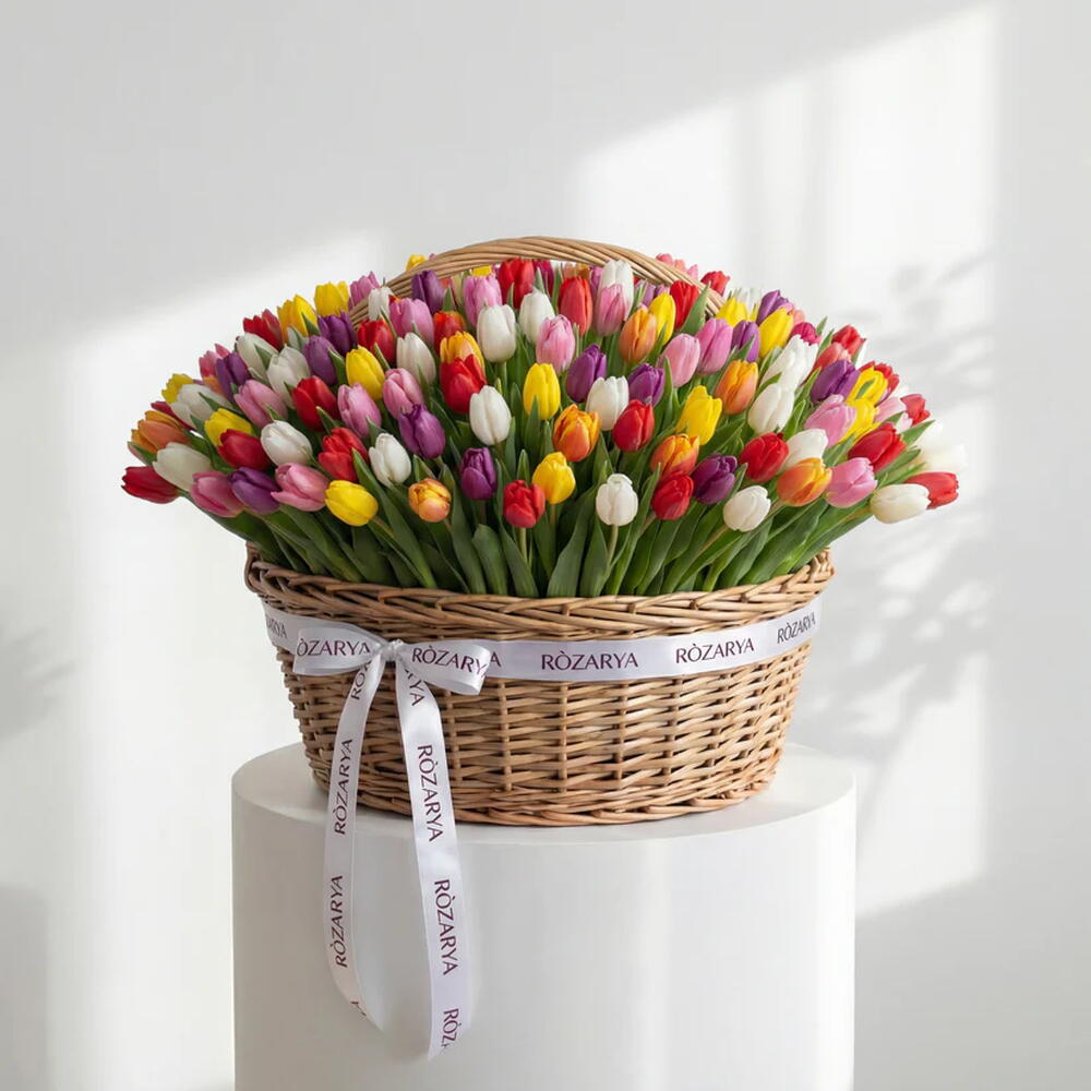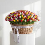 A spectacular grand-scale arrangement of 201 premium mixed-color tulips. Presented in a luxury natural wicker basket and finished with the signature branded ribbon. The ultimate vibrant architectural statement for celebrating lifes biggest moments. • Please Note: As flowers are natural products, actual colors may vary slightly from digital images due to seasonal growth and lighting conditions. We guarantee that the overall style and premium quality as well as freshness of your arrangement will always be maintained.