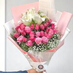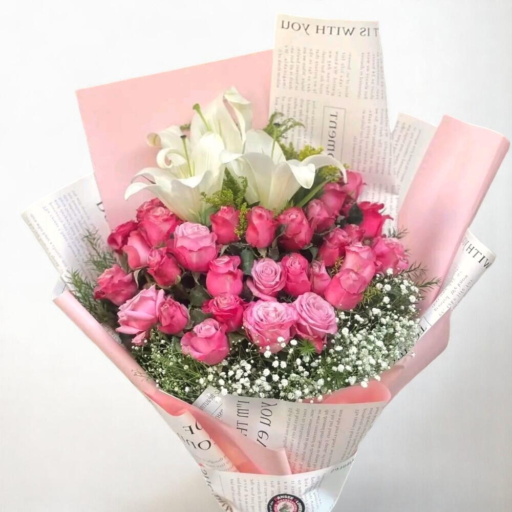 Overflowing with charm and elegance, this bouquet features a sea of delicate pink roses, crowned by pristine white lilies for a luxurious touch. Wrapped in modern pastel newspaper-style paper, its a perfect gift for romantic occasions, birthdays, or just to make someone smile. The vibrant pink roses symbolize admiration and sweetness, while the lilies add purity and grace. Baby’s breath brings a cloud-like softness, making the bouquet feel ethereal. To maintain its beauty, place the bouquet in clean, cool water and trim the stems every two days. Avoid direct sunlight and change the water daily to ensure lasting freshness and fragrance.