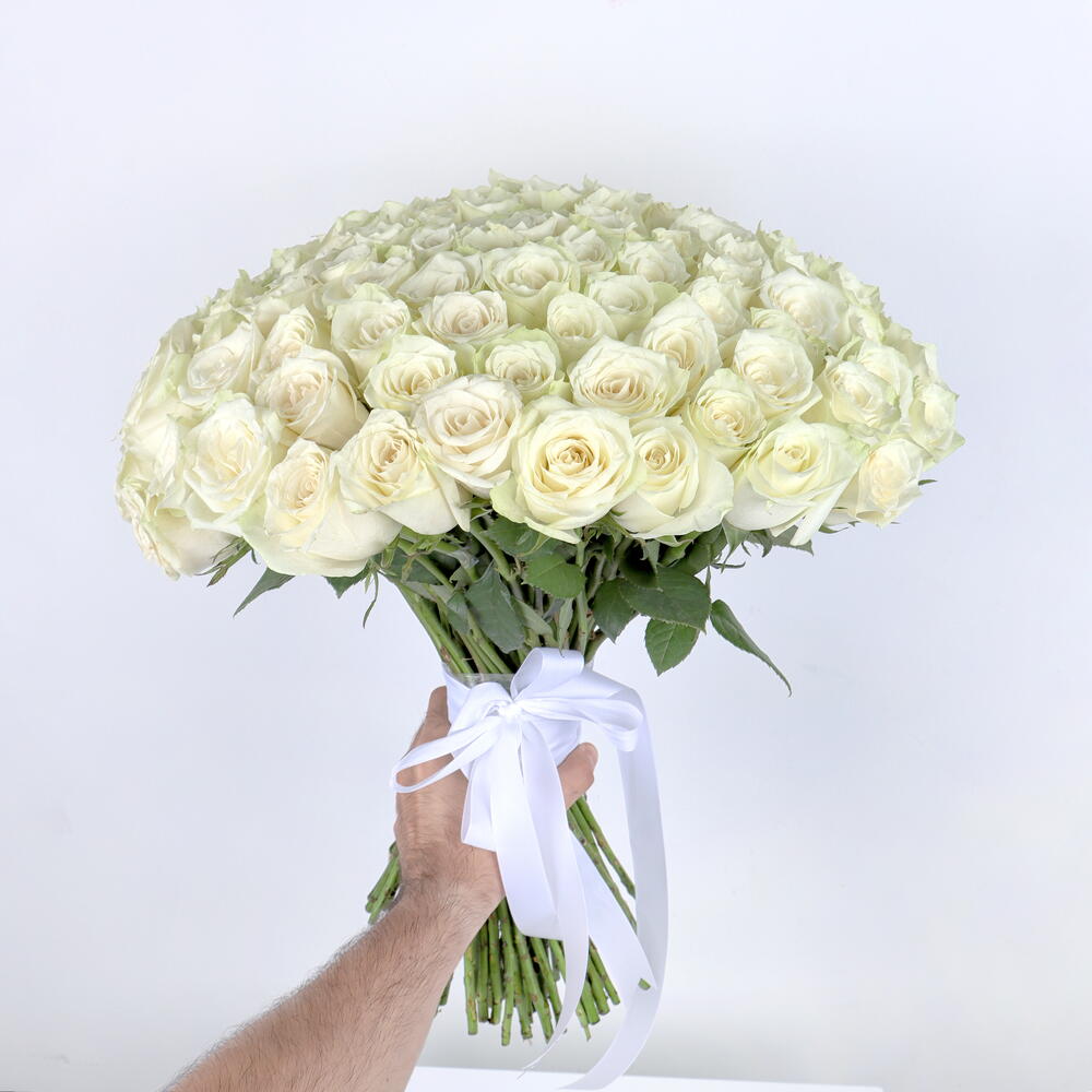A modern bouquet of flowers. Flowers have an expressive language, especially when words are absent and expression is difficult, so they alone remain bright to carry the meanings of expression. This bouquet is called Al Asriyah because without a wrapper, you feel free when presenting it. It consists of 100 white roses with a white ribbon.
