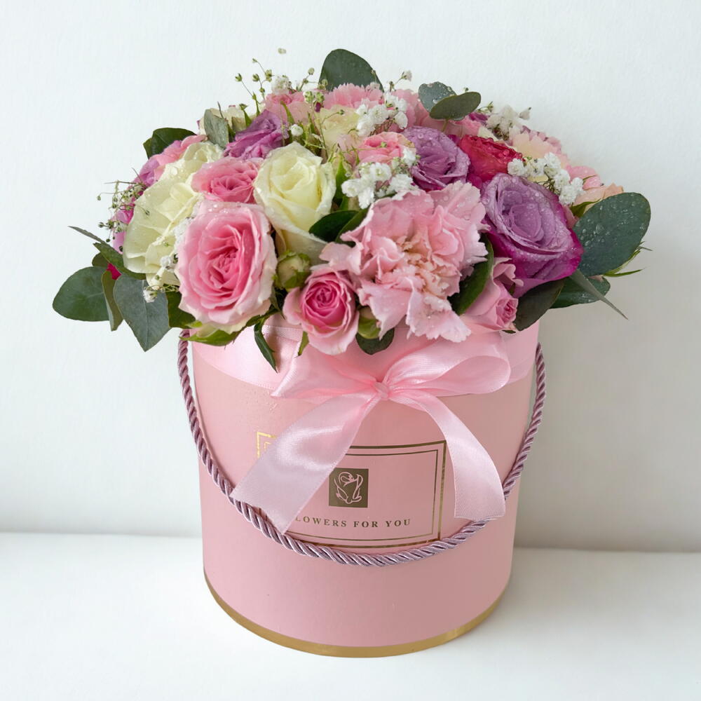 Ribbon - 1 pcs Box - 1 pcs White rose - 5 pcs pink spray rose - 3 pcs purple rose - 6 pcs pink carnation - 4 pcs eucalyptus leaves - 1 pcs