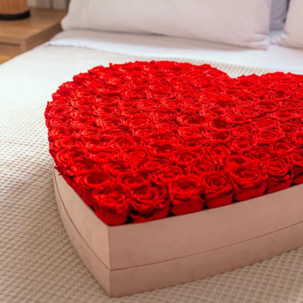 Make a grand romantic statement with this luxurious bouquet of 200 red roses, elegantly arranged in a large heart-shaped box. Each rose is hand-selected for freshness and perfection, creating a premium floral gift that radiates passion, love, and sophistication. Why You’ll Love It: Fresh and handpicked: 200 long-stemmed red roses for a striking, full arrangement Elegant presentation: Dome-shaped roses in a luxurious heart-shaped box Perfect gift for: Girlfriend, wife, partner, or someone special Ideal occasions: Anniversaries, Valentine’s Day, proposals, birthdays, romantic surprises, or luxury gifting Care Tips: Keep in a cool, shaded place Refresh water or floral foam daily to maintain freshness Enjoy up to 7 days of flawless blooms Enhance Your Gift: Pair this luxury 200 red roses heart box with premium chocolates, balloons, or a vase to make your gesture even more unforgettable.