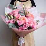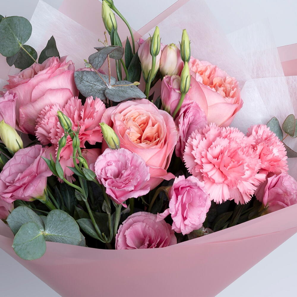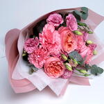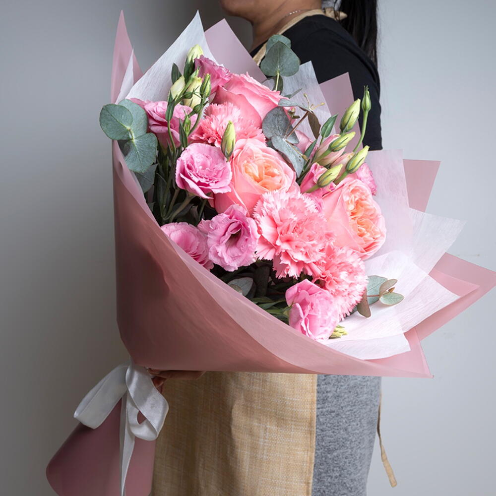 carnation pink - 3 pcs lisianthus pink - 5 pcs eucalyptus leaves - 3 pcs wrapping paper pink - 3 pcs pink expression garden rose - 3 pcs tissue paper white - 1 pcs