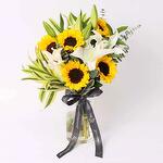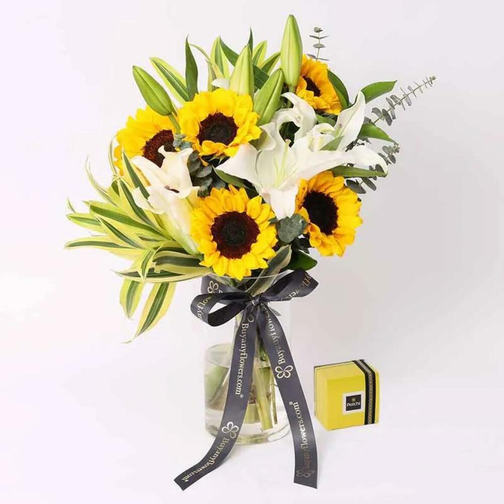 sunflowers - 5 pcs white lilies stems - 2 pcs eucalyptus leaves - 4 pcs song of india - leaves - 2 pcs deluxe patchi chocolates - 200 g glass vase and tied with a ribbon bow - 1 pcs
