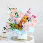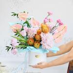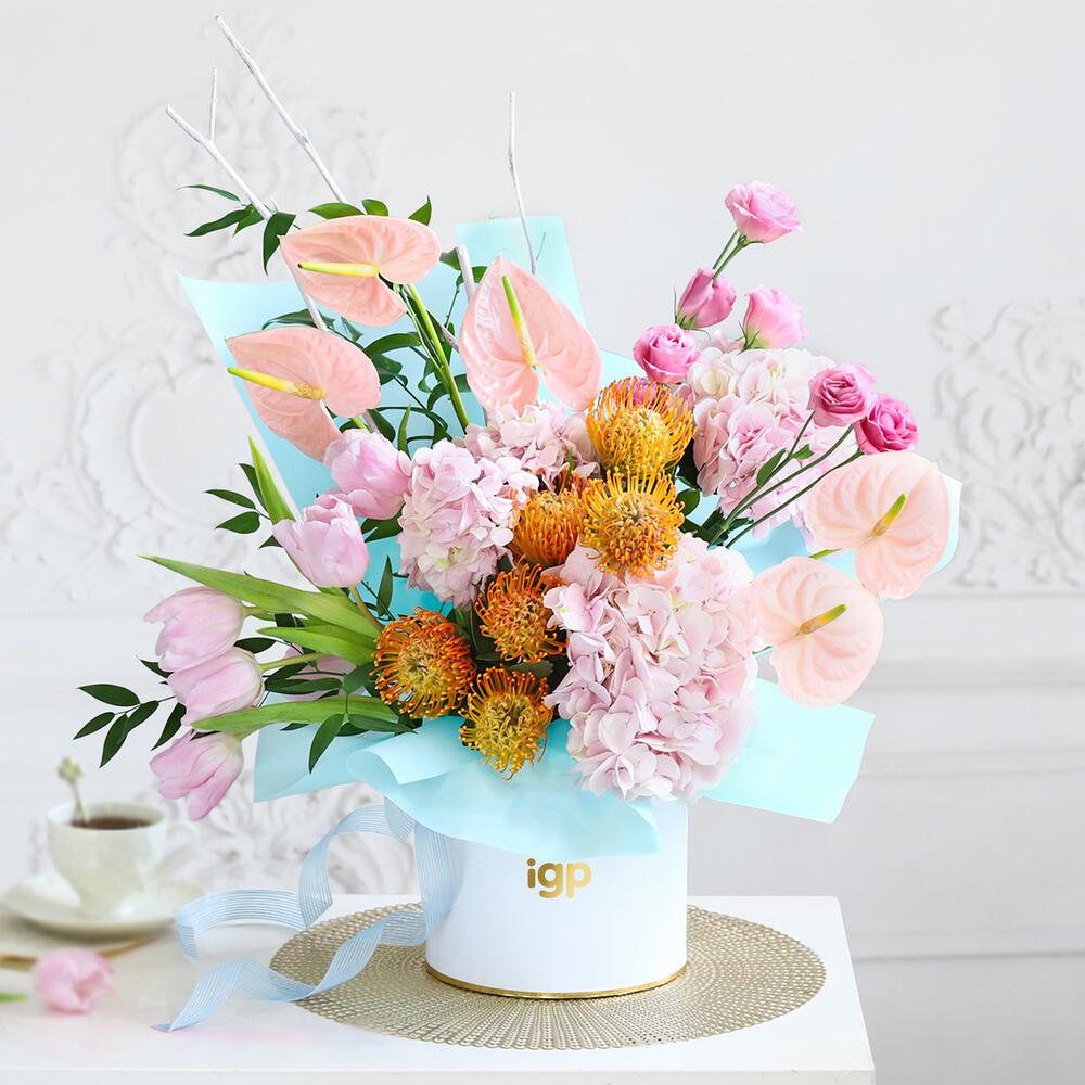 Hydrangea - 3 pcs Anthurium - 5 pcs Lisianthus - 2 pcs pink tulips - 4 pcs orange pinchusions - 6 pcs