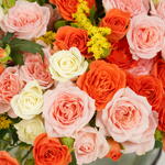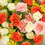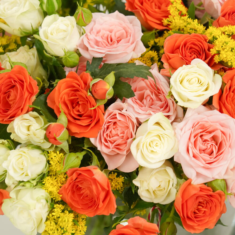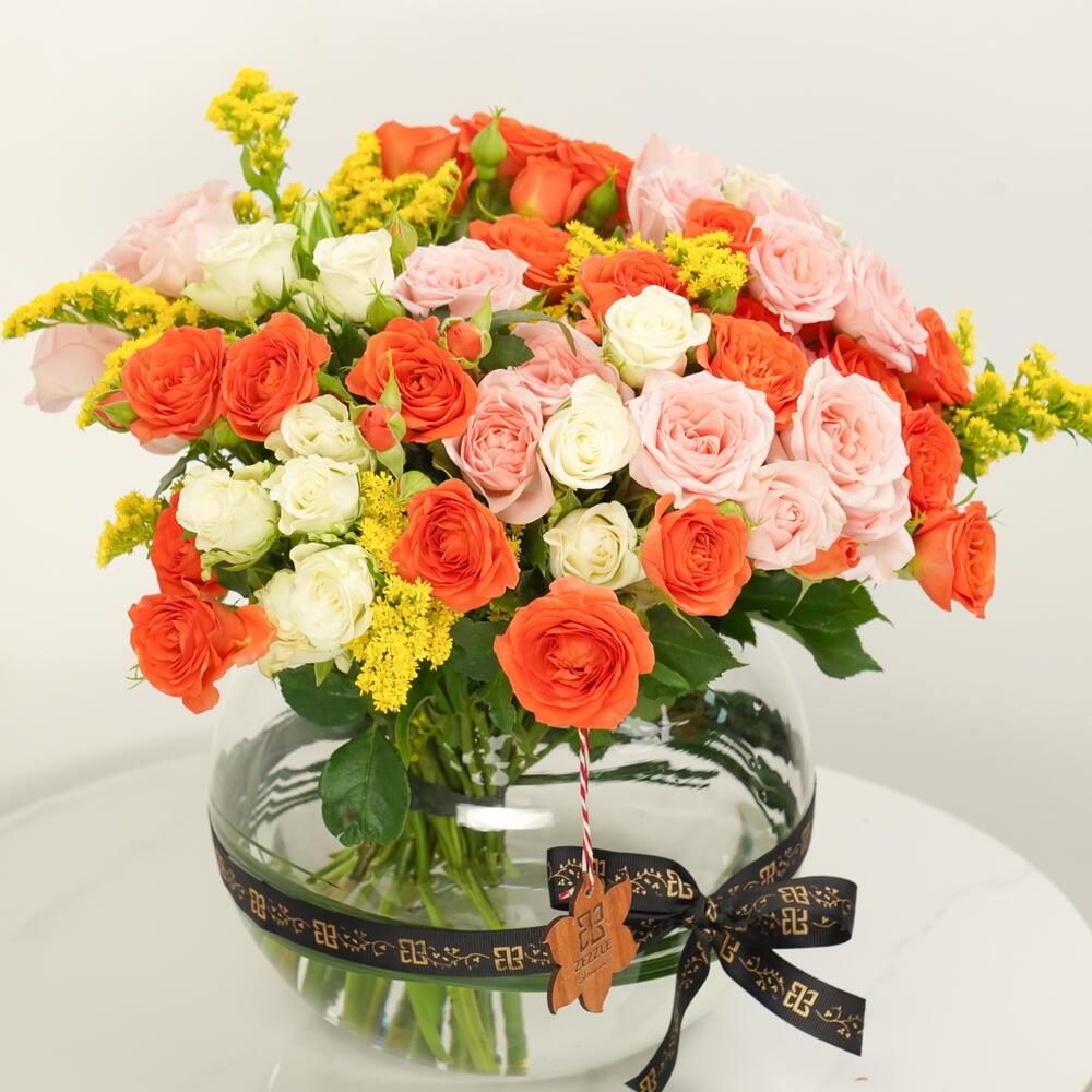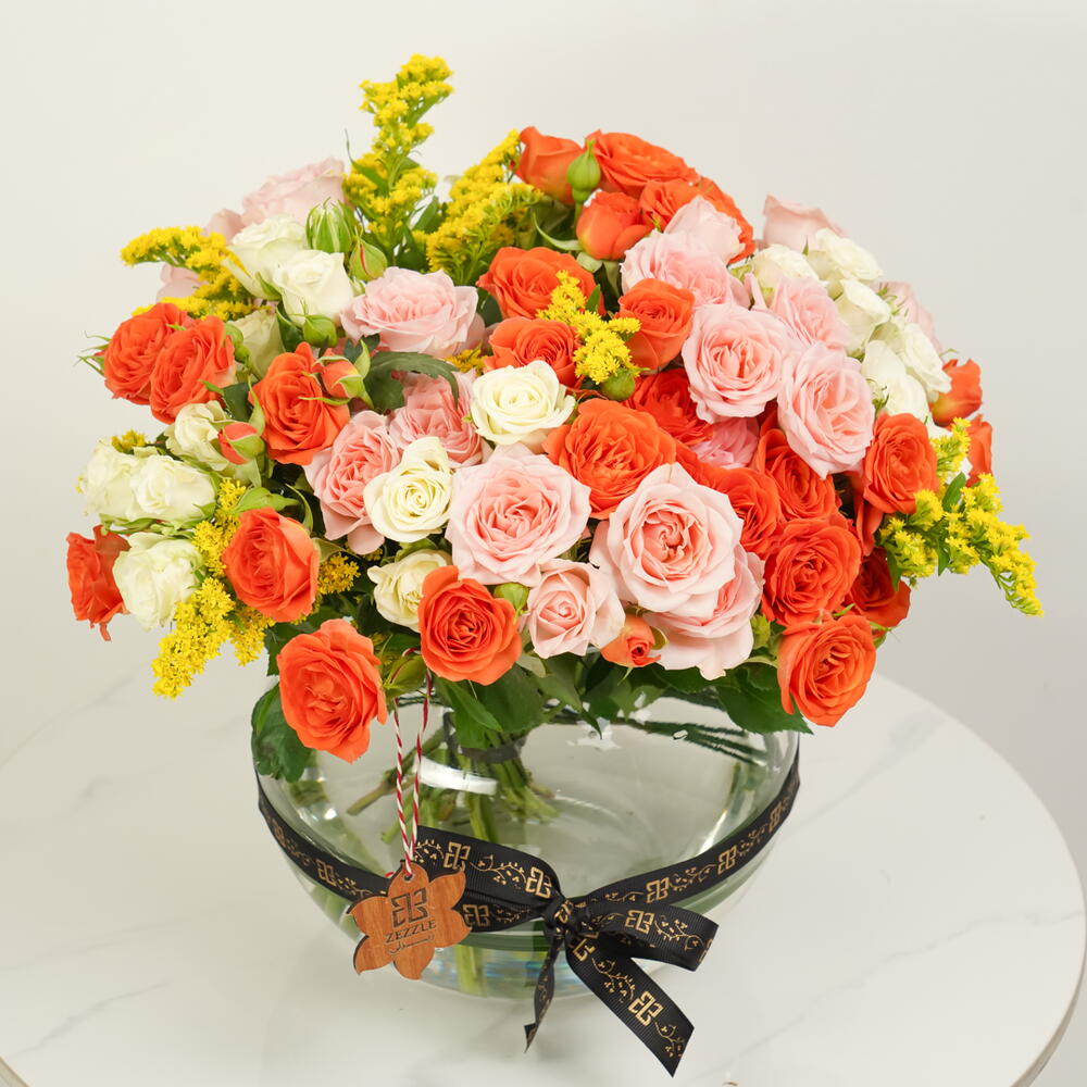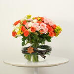 A cheerful and colorful glass bowl arrangement featuring 10 pink spray roses, 10 orange spray roses, 10 white spray roses, and 5 yellow solidago. Perfect for brightening any occasion with elegance and charm.