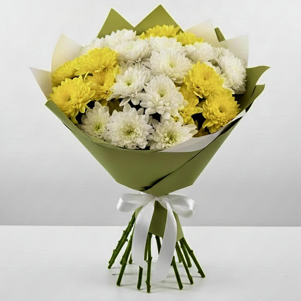A fresh and cheerful arrangement of 11 yellow and white chrysanthemums, bringing brightness and purity together. Ideal for birthdays, congratulations, get-well gifts, and home décor. Simple, lively, and beautifully wrapped.