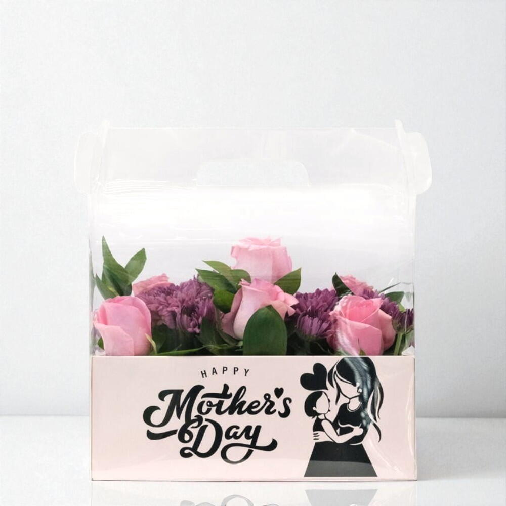 Brighten her day with this elegant pink and purple floral arrangement, specially crafted for Mothers Day. Delicate pink roses symbolize admiration and appreciation, while the rich purple blooms add a royal touch. Set in a chic transparent box with a “Happy Mother’s Day” message, it’s the perfect heartfelt gift. A charming way to express love, gratitude, and admiration for the most important woman in your life. To keep flowers fresh, place in a cool area away from direct sunlight and refill water if needed.