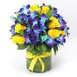 Product Details: 15 Yellow Roses 6-8 Blue Orchids Leaves - Massangeana and 3-5 Single Ruscus Prepared in a Cylinder Glass Vase