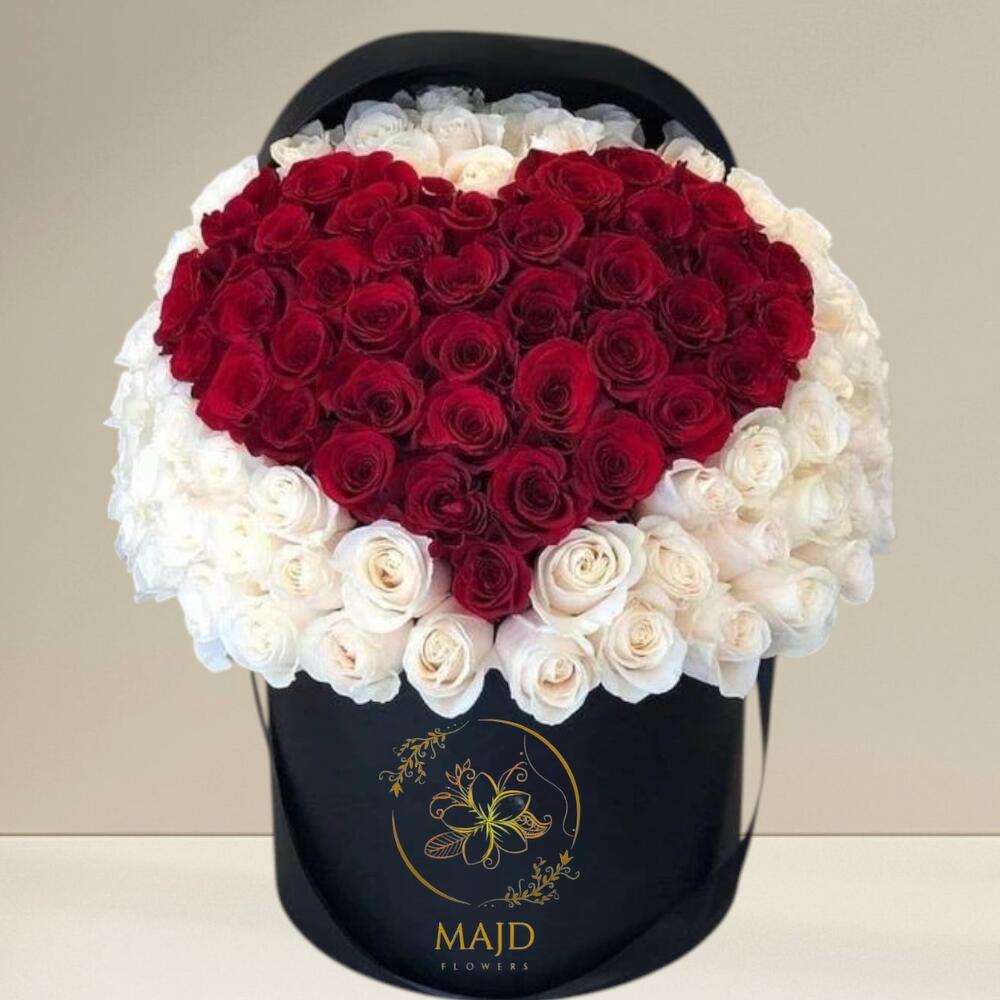 **Pure elegance in every petal 🤍✨ Celebrate love, grace, and beauty with our signature white and red rose box. Perfect for every occasion — now available at Majd Flowers.