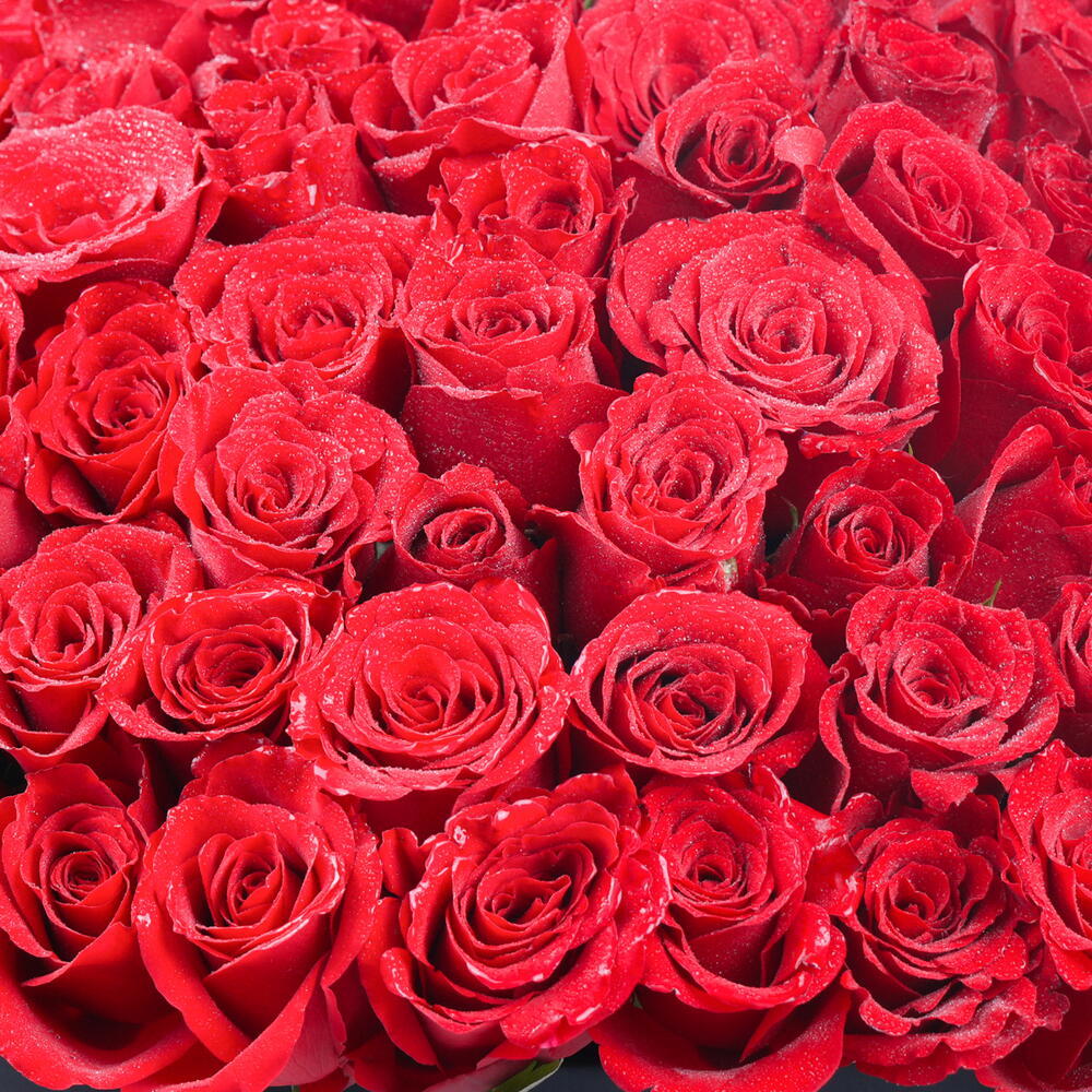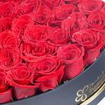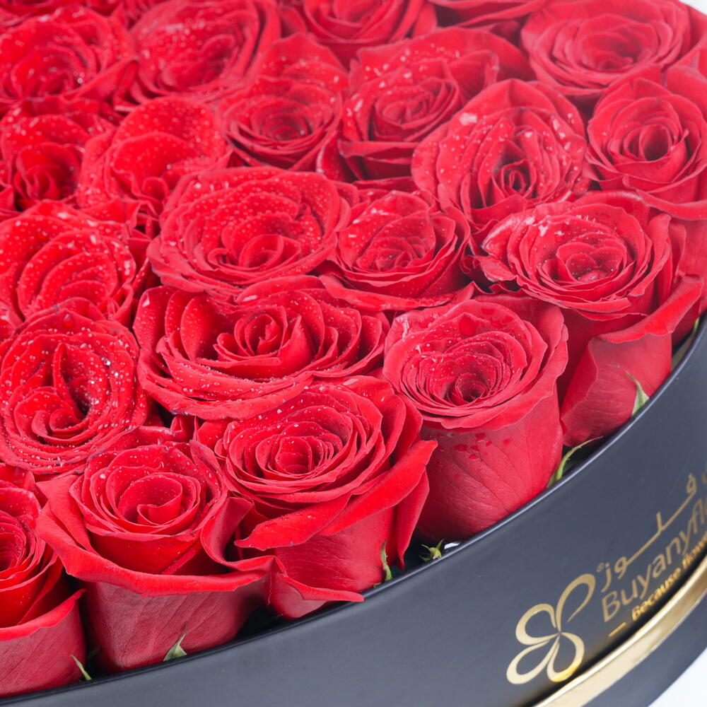 red roses - 33 pcs medium black heart shape box - 1 pcs