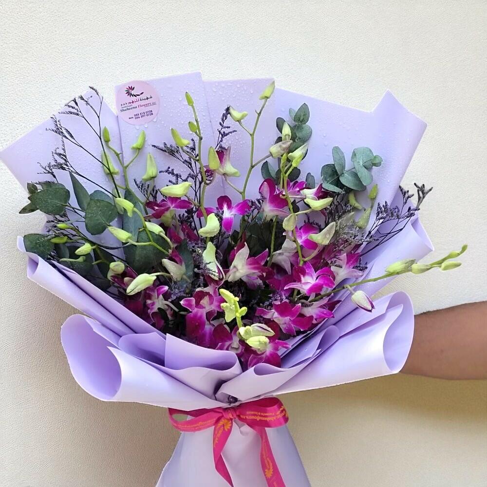 My Orchid: Bunch of 10 Purple Orchids in Pretty Purple Wrapping Indulge in the enchanting allure of My Orchid, a mesmerizing floral arrangement featuring 10 exquisite purple orchids, elegantly wrapped in beautiful purple packaging. This stunning bouquet is perfect for conveying admiration, elegance, and unique sentiments, making it an ideal gift for any special occasion. Key Features: Exquisite Purple Orchids: 10 hand-selected purple orchids known for their vibrant color and long-lasting freshness. Pretty Purple Wrapping: Thoughtfully wrapped in elegant purple packaging, enhancing the overall presentation and making it ready for gifting. Perfect for Any Occasion: Ideal for birthdays, anniversaries, celebrations, or simply to show someone special how much you care. Freshness Guaranteed: Each orchid is carefully chosen to ensure maximum freshness and longevity, providing a beautiful and enduring display. Why Choose My Orchid? Symbolism: Purple orchids symbolize admiration, respect, and elegance, making them a perfect choice for expressing special and heartfelt emotions. Elegant Presentation: The combination of stunning purple orchids and pretty purple wrapping creates a visually captivating and sophisticated floral gift. Convenience: Delivered in stylish purple wrapping, My Orchid is ready to be gifted, ensuring a hassle-free and delightful experience. Versatile Gift: Suitable for various occasions, this bouquet conveys a sense of luxury and thoughtfulness.