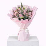 Pink roses with pink baby roses — classic and display-ready .Light Pink Rose 10 Stems, Pink Baby Rose 5 Stems, Pink Eustoma 3 Stems, Purple Limonium 1 Stem, Gypsophila 1 Stem, Eucalyptus 3 Stems