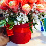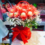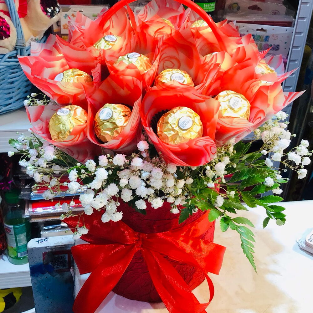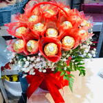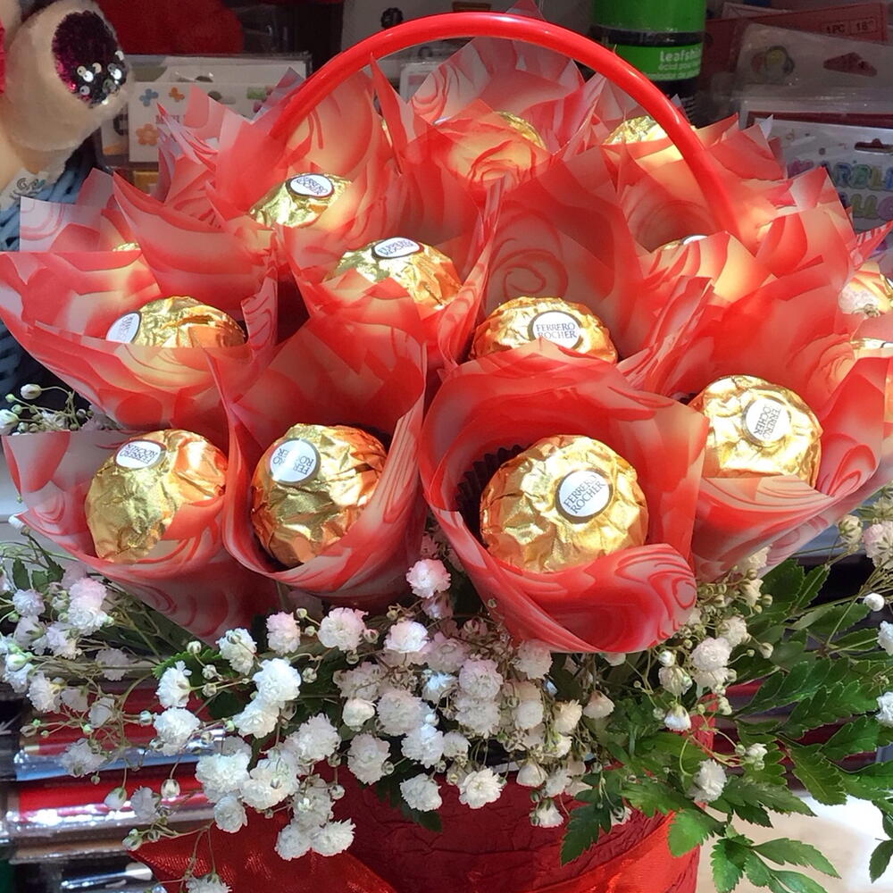 Basket - 1 pcs gipsophila - 2 pcs leather fern - 3 pcs wrapping chocolate - 20 pcs